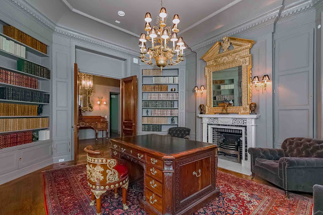 In 2014, the façade was also changed from Italianate to Greek revival. It features a two-story portico with imposing columns serving as foreground to a full-width second floor loggia. The sprawling interior spans approximately 11,800 of livable square footage. Additionally, the full-sized cellar and attic offer 10,000 sq. ft. of supplementary amenity, storage, and utility spaces. Six bedrooms, six full and three half baths, and a full floor allocated to entertaining and recreation ensure plenty of room for sumptuous living. The 3500 sq. ft. carriage house may also be transformed into a three-story auxiliary house for guest and staff suites.